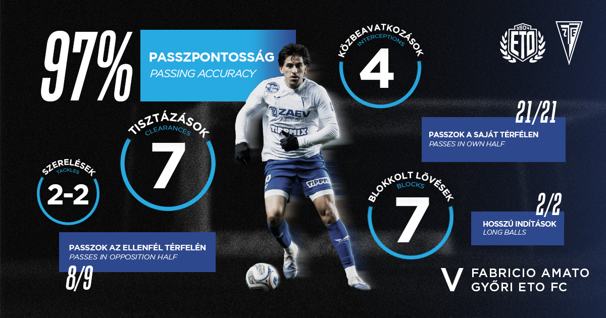 Fabricio Amato az ETO elleni mérkőzésen eddigi legjobb teljesítményét nyújtotta kék-fehér színekben. Középpályásunk remekül látta el a védekezői feladatokat, ezen felül pedig 97%-os passzpontossággal végzett. Így tovább, Fabri!