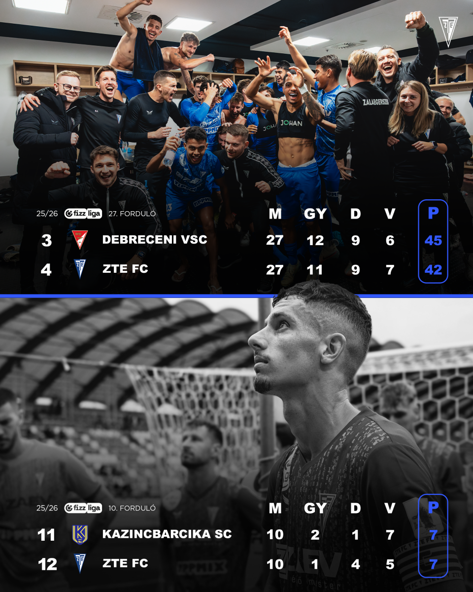 Együttesünk 42 ponttal áll a tabellán, és ismét egy impozáns sorozatot tudhat maga mögött. A ZTE FC ugyanis kilenc tétmérkőzés óta veretlen: hat győzelem mellett három döntetlent ért el. Három ponttal vagyunk lemaradva az előttünk álló DVSC mögött, amely a hétvégén a Ferencvárost fogadja, és szintén +9-es gólkülönbséggel vág neki a tavaszi hajrának.