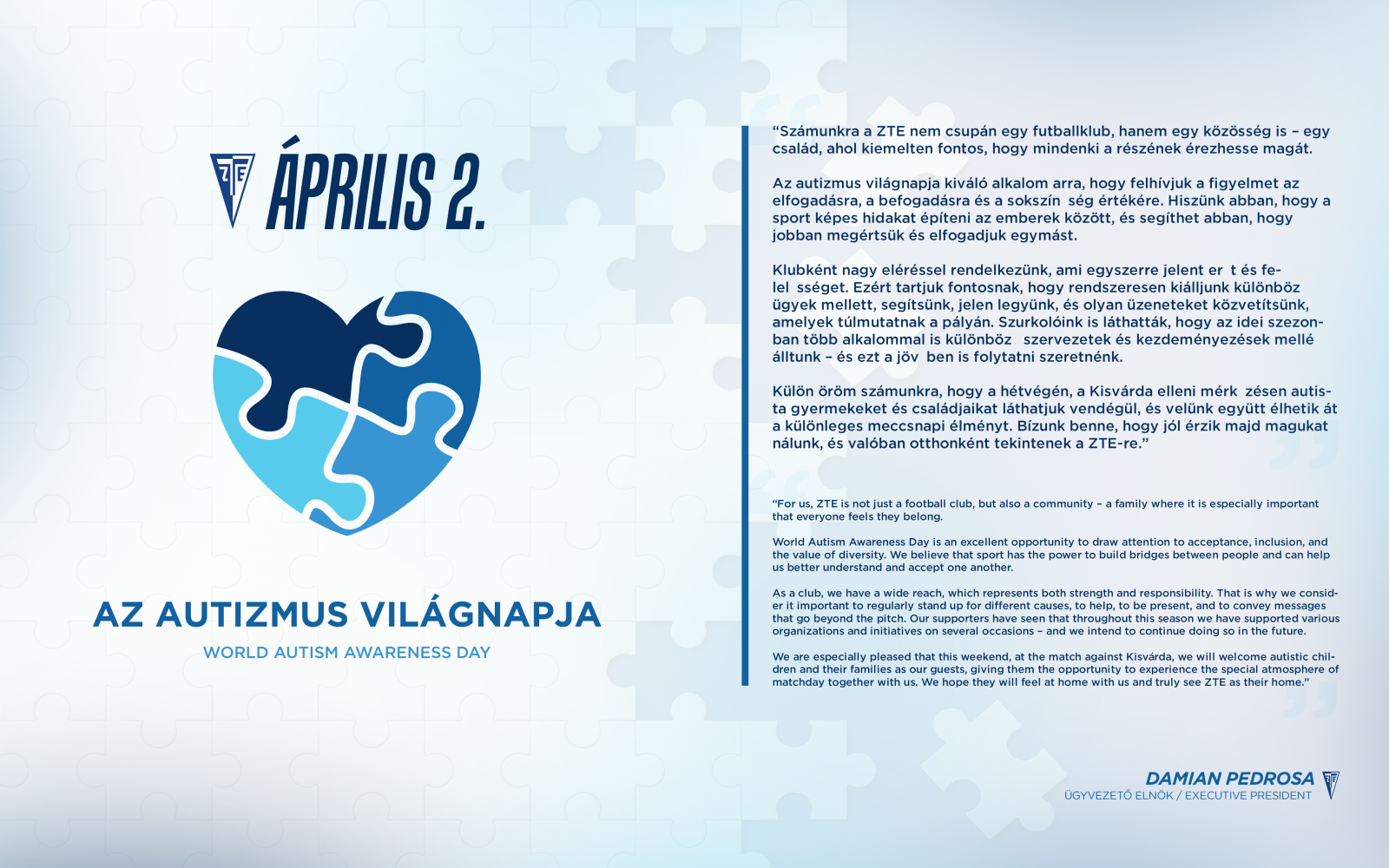 Ahogy arra a héten már felhívtuk a figyelmet, április 2-a világszerte az autizmus világnapja. Ennek szellemében – ahogyan klubunk az idei szezon során már több alkalommal is tette – csatlakozunk a kezdeményezéshez, és a Zalai Autistákat Segítő Egyesület részére több mint 500 belépőjegyet ajánlottunk fel a Keleti lelátó II. szektorába. A zajmentesítés érdekében a szomszédos I. és III. szektor jegyei ezúttal nem kerülnek értékesítésre. Emellett a ZTE Arénába kilátogató szurkolók között április 4-én 1000 darab Kék Szív kitűzőt osztunk szét.